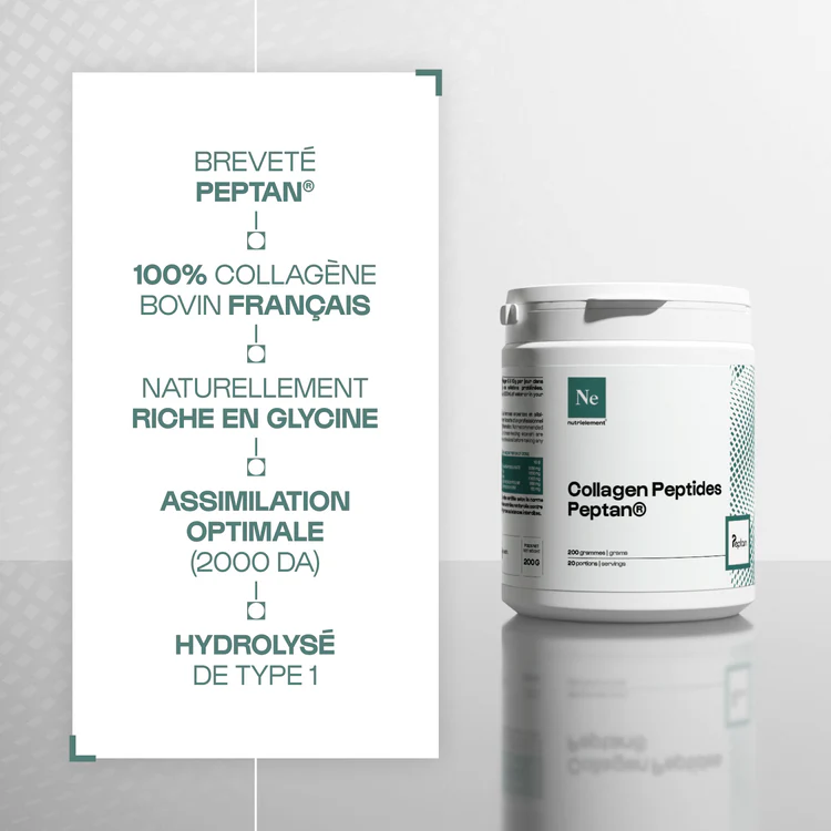 Le Collagène Bovin Nutrimuscle est un collagène en poudre Nutrimuscle formulé à partir de peptides de collagène Peptan® de type I, issus de collagène bovin hydrolysé à 2000 Daltons. Fabriqué en France, il offre une assimilation optimale pour soutenir la résistance des tendons, la récupération musculaire et la mobilité articulaire, sans additif superflu, dans une formule pure et hautement biodisponible.