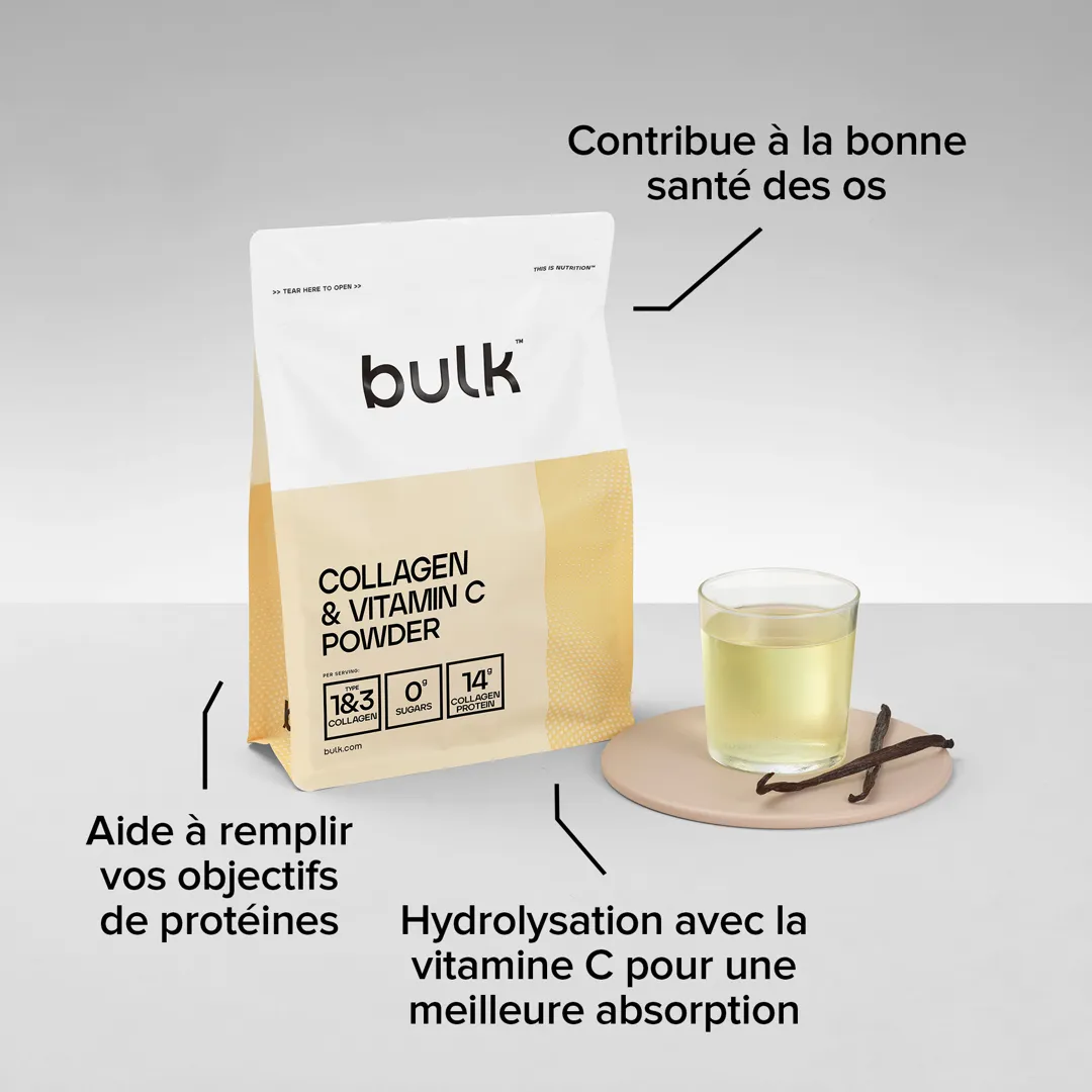 Le Collagène de Bulk associe collagène hydrolysé et vitamine C pour soutenir la santé des articulations, des os et de la peau. Chaque portion apporte 12 g de protéines issues du collagène Bulk, avec une absorption rapide et une boisson légère au quotidien. Enrichi en vitamine C, ce bulk collagene vitamine c contribue à la formation normale du collagène pour accompagner vos entraînements et votre bien-être.