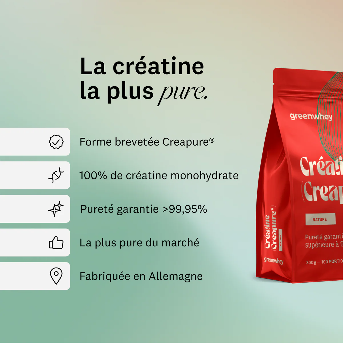 La Créatine Creapure de Greenwhey est une créatine monohydrate ultra pure (>99,95%), issue du label Creapure® fabriqué en Allemagne. Sans additifs, vegan et hautement assimilable, elle soutient la performance musculaire, la force et la récupération. Cette créatine Greenwhey garantit une qualité premium pour des efforts courts et intenses, avec une pureté exceptionnelle rarement égalée sur le marché.