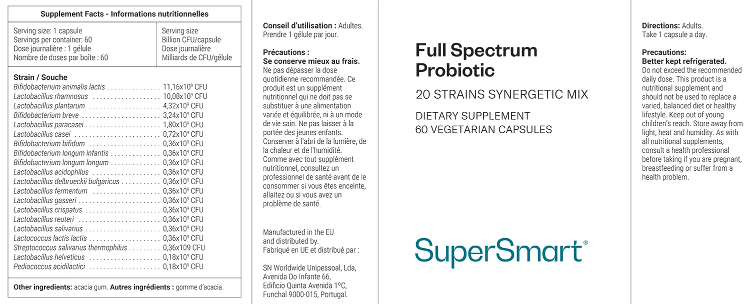 Le Full Spectrum Probiotic de Supersmart est une formule avancée de supersmart full spectrum probiotic combinant 20 souches probiotiques synergiques. Hautement dosé à 36 milliards de CFU par jour, ce supersmart full spectrum probiotic formula favorise l’équilibre du microbiote intestinal et le confort digestif. Sans gluten, sans lactose et sans excipients controversés, il offre une diversité bactérienne optimale pour une efficacité renforcée.