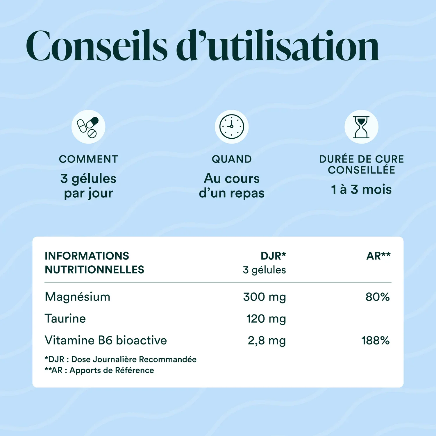 • Améliore l’assimilation du magnésium grâce à la taurine et à la vitamine B6
