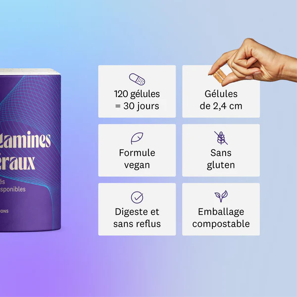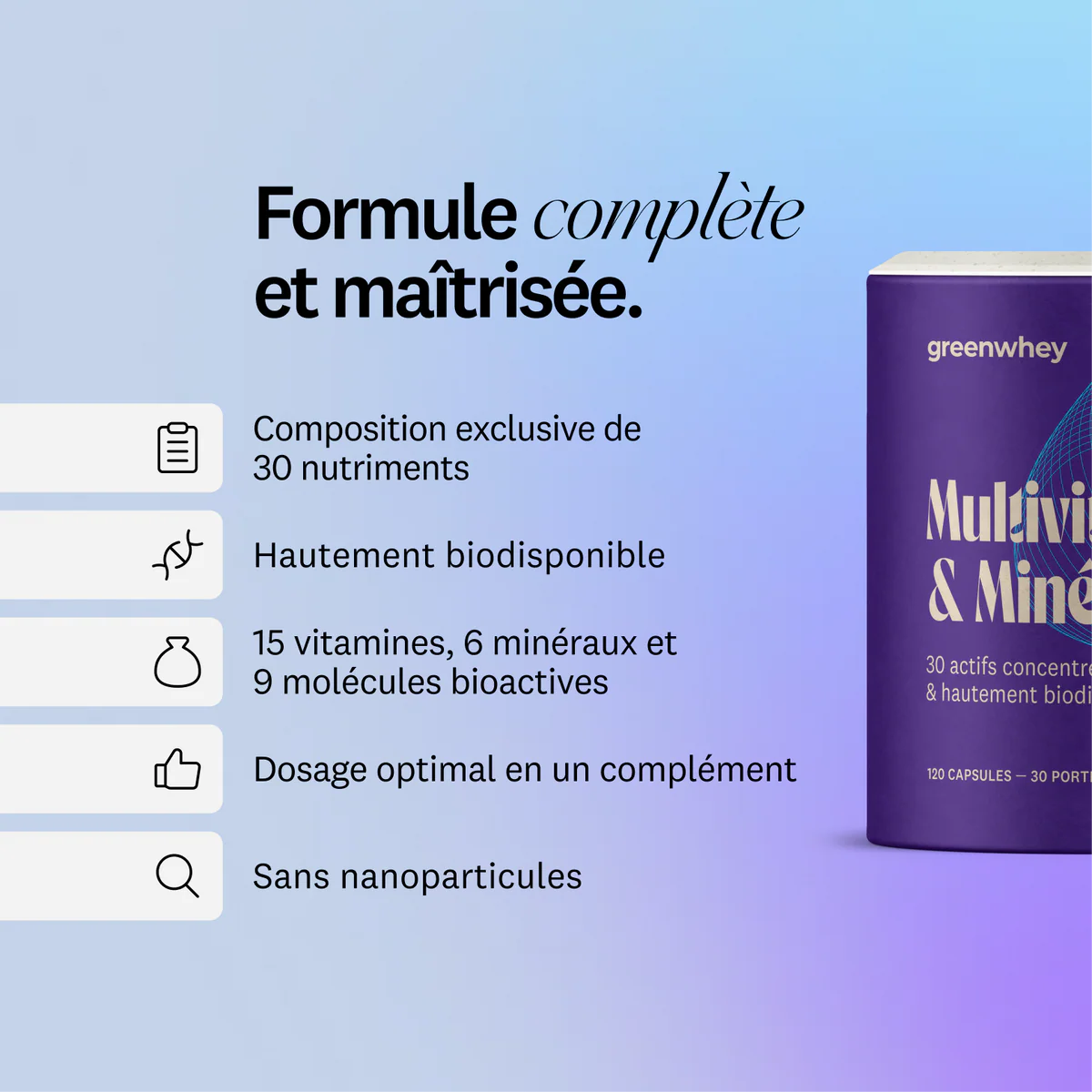 Le Multivitamines Greenwhey est une formule complète de 30 nutriments associant 15 vitamines, 6 minéraux et 9 molécules bioactives. Cette multivitamine Greenwhey hautement biodisponible aide à réduire la fatigue, soutient le système immunitaire et protège les cellules contre le stress oxydatif. Sa composition vegan, sans gluten et sans nanoparticules en fait un allié quotidien exigeant.