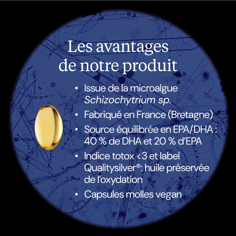 L’Oméga-3 Végétal Dynveo est une source 100% vegan de DHA et EPA issue de microalgues Schizochytrium sp. Cultivé en fermenteur à l’abri des pollutions, il offre une forme triglycéride naturelle hautement assimilable. Grâce à la technologie Qualitysilver® (TOTOX < 3), cet omega 3 vegetal Dynveo garantit une stabilité optimale et une tolérance parfaite, sans goût ni odeur de poisson.