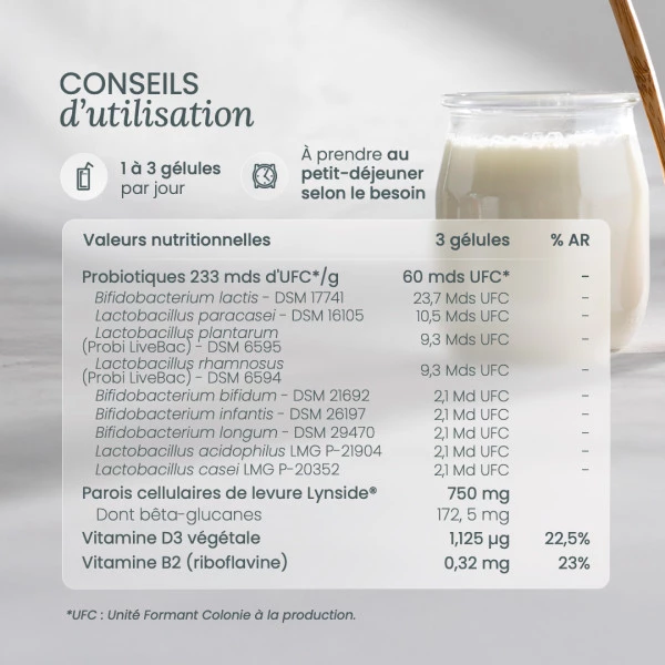 • Probiotiques (9 souches lactiques) : 60 milliards d’UFC