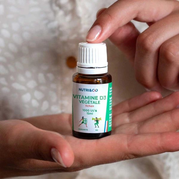 La Vitamine D Végétale Nutri&Co est une vitamine D3 issue de lichen boréal, intégrée dans une huile de colza vierge bio pour une absorption optimale. Chaque goutte apporte 1000 UI de vitamine D, permettant un dosage précis et modulable pour toute la famille. Cette vitamine D Nutri&Co est 100 % végétale, sans excipients controversés, et formulée pour soutenir immunité et santé osseuse au quotidien.