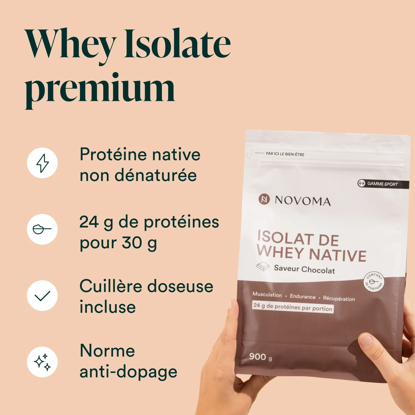 L’Isolat de Whey Native en Poudre Novoma est une protéine native issue de lait frais de vaches élevées en pâturages français, obtenue par microfiltration à froid. Riche en protéines pures et naturellement concentrée en BCAA, cette Novoma whey est faible en lactose et enrichie en enzymes digestives pour une assimilation optimale. Certifiée Sport Protect, elle soutient efficacement la récupération et le développement musculaire.