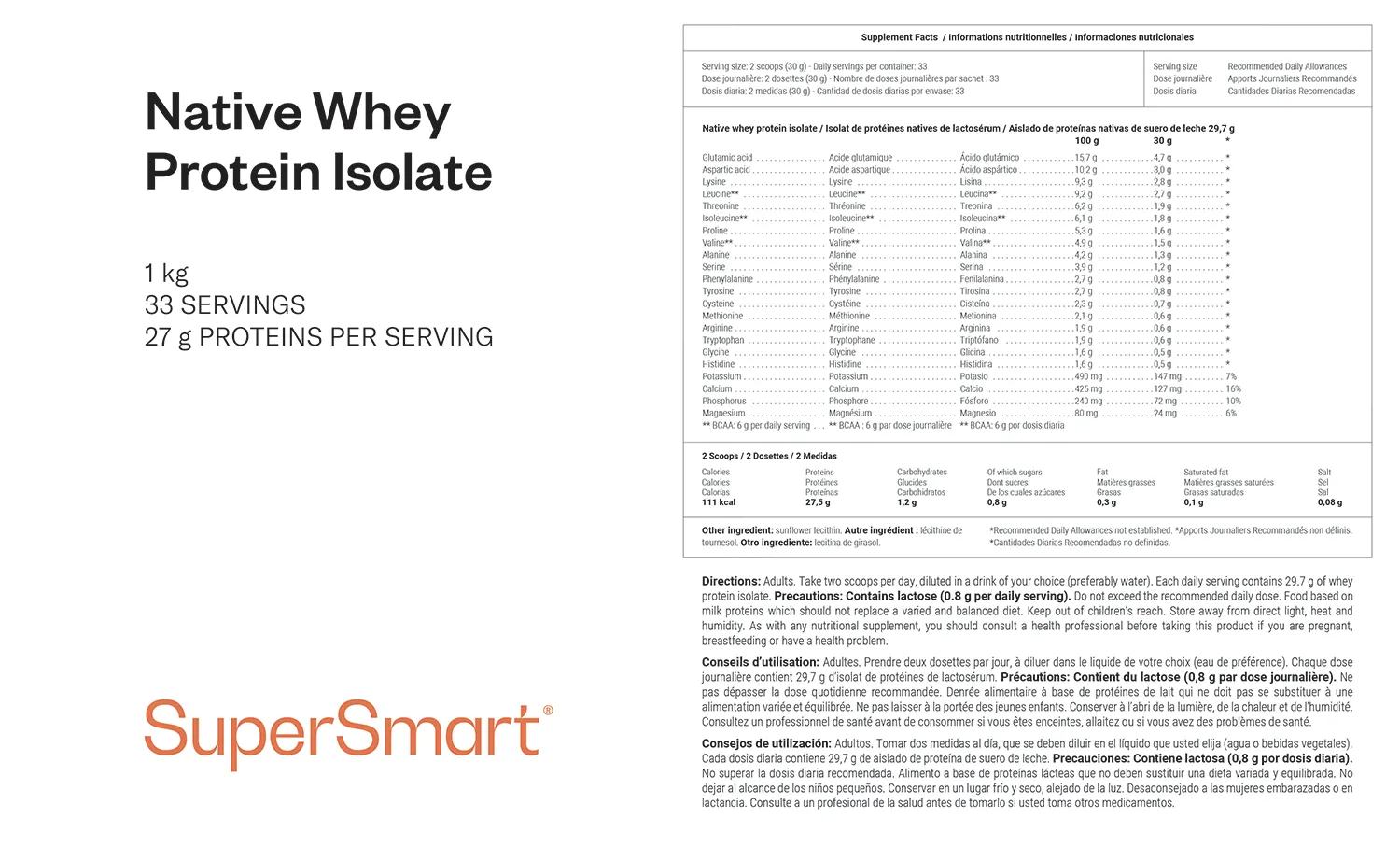 L’Isolat de whey native Supersmart est une protéine en poudre ultra-pure, conçue pour soutenir efficacement le développement de la masse musculaire. Issue de lait frais de vaches irlandaises nourries à l’herbe, cette préparation protéine whey Supersmart est obtenue par microfiltration à flux croisés, garantissant une structure native intacte. Avec 92 % de protéines, une faible teneur en lactose et une excellente digestibilité, elle répond aux exigences des sportifs les plus rigoureux.