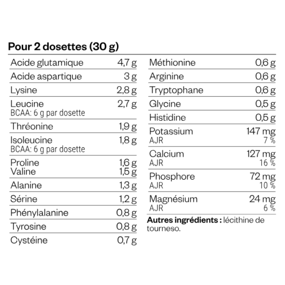 • Profil complet en acides aminés essentiels et 20 % de BCAA naturellement présents
