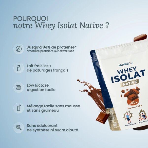 La Whey Isolate Native Nutri&Co est une whey isolate native Nutri and Co d’une pureté exceptionnelle, issue de lait frais de pâturages français et obtenue par micro- et ultrafiltration. Avec jusqu’à 94 % de protéines, une teneur en lactose < 0,02 % et une excellente digestibilité, elle soutient efficacement la construction musculaire et la récupération, sans édulcorant de synthèse ni sucre ajouté.