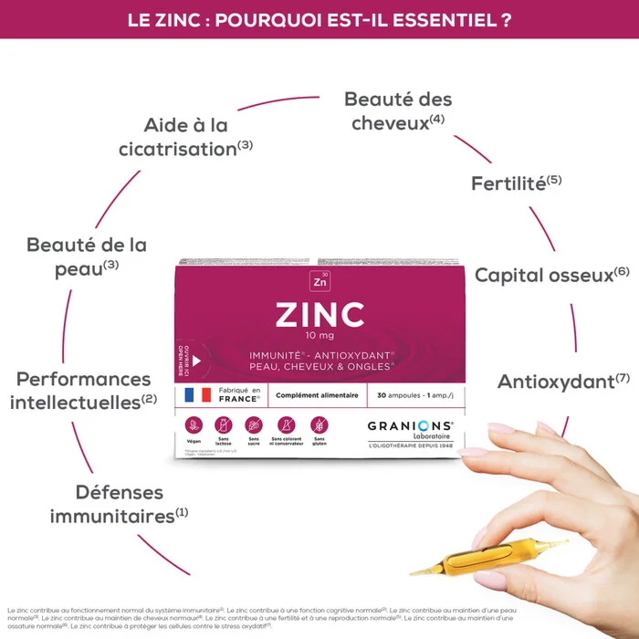 Le Zinc de Granions est un complément pratique sous forme d’ampoules, apportant 10 mg de zinc (100 % des apports recommandés). Ce granions de zinc contribue au bon fonctionnement du système immunitaire, protège contre le stress oxydatif et favorise la santé de la peau, des cheveux et des ongles. Sa formule pure et végan, sans additifs, fait des granions zinc ampoules une solution simple et efficace au quotidien.