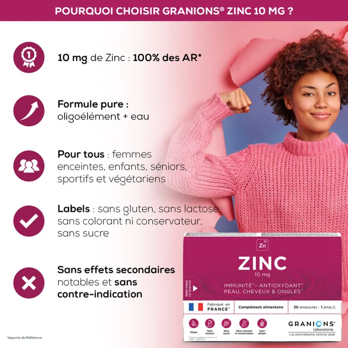 Les granions zinc ampoules conviennent à de nombreux profils grâce à leur composition épurée : zinc + eau, sans sucre, sans gluten, sans lactose et sans conservateur. Un vrai atout pour intégrer facilement le granions zinc dans une routine bien-être ciblée.