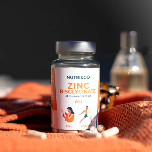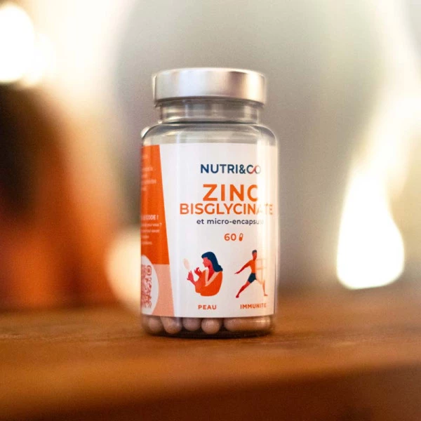 Le Zinc Bisglycinate Nutri&Co associe zinc bisglycinate Nutri&Co et zinc liposomal Nova® pour une absorption optimale. Cette formule innovante délivre 100 % des apports journaliers en une seule gélule, tout en garantissant une excellente tolérance digestive. Enrichi en sélénium, le nutri&co zinc soutient efficacement l’immunité, la peau et les fonctions hormonales.